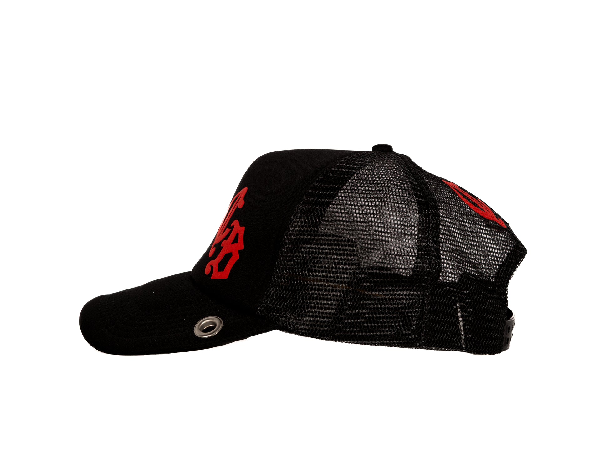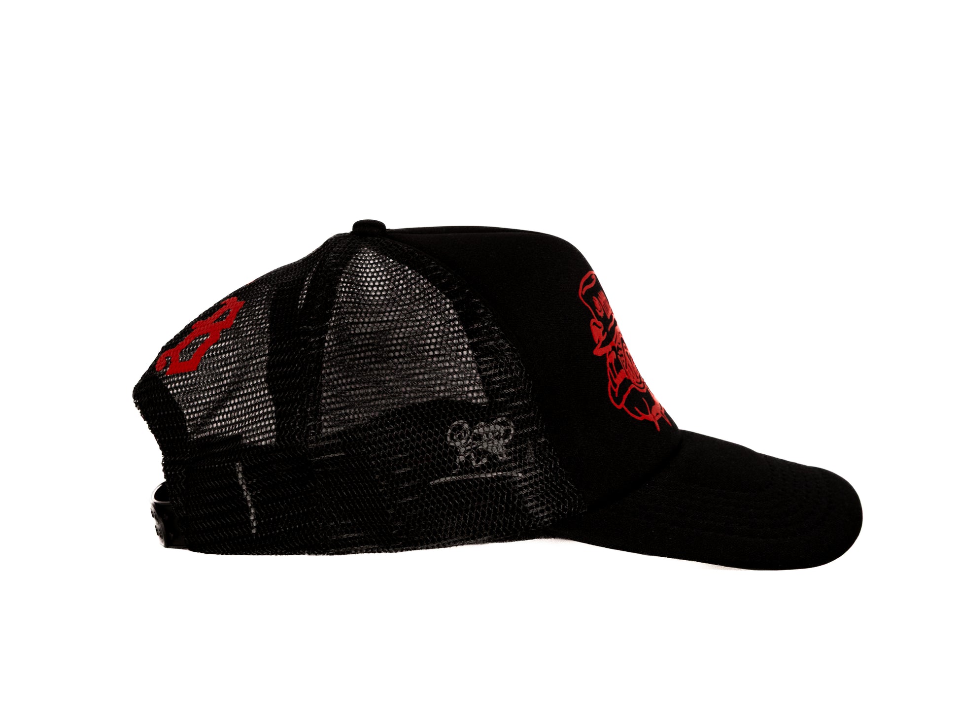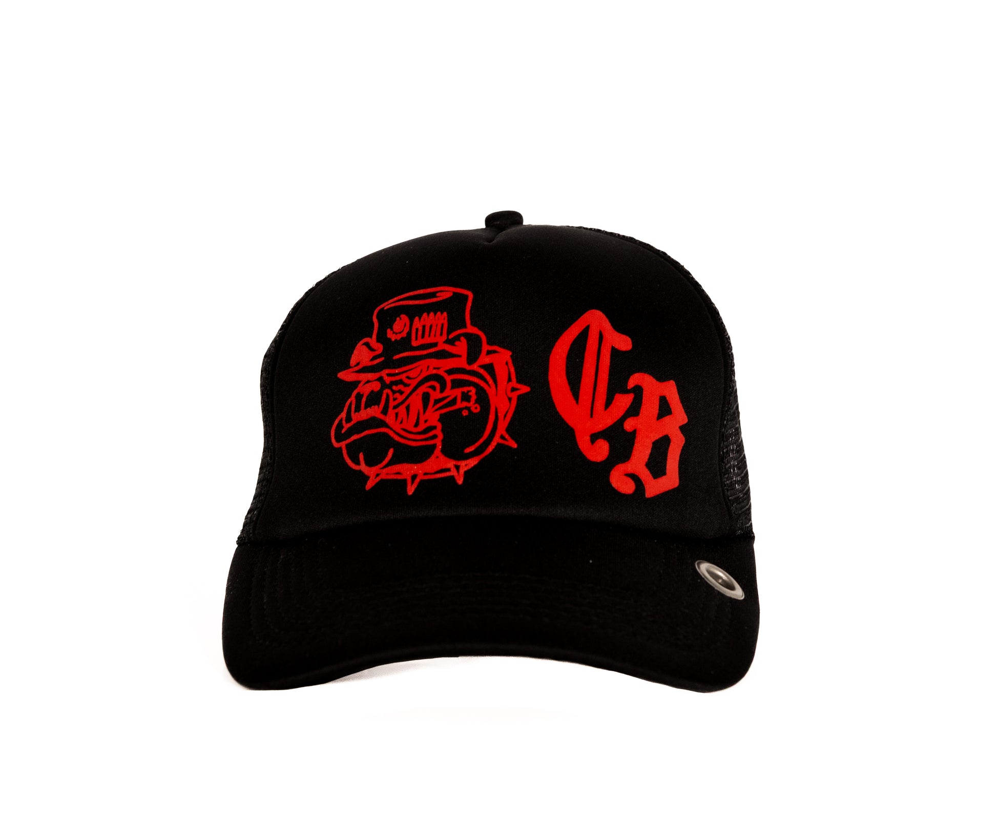 3D puff printed Bulldog Marine Logo CB initials on a black trucker hat. Sewn tag inside hat, grommet hole on brim