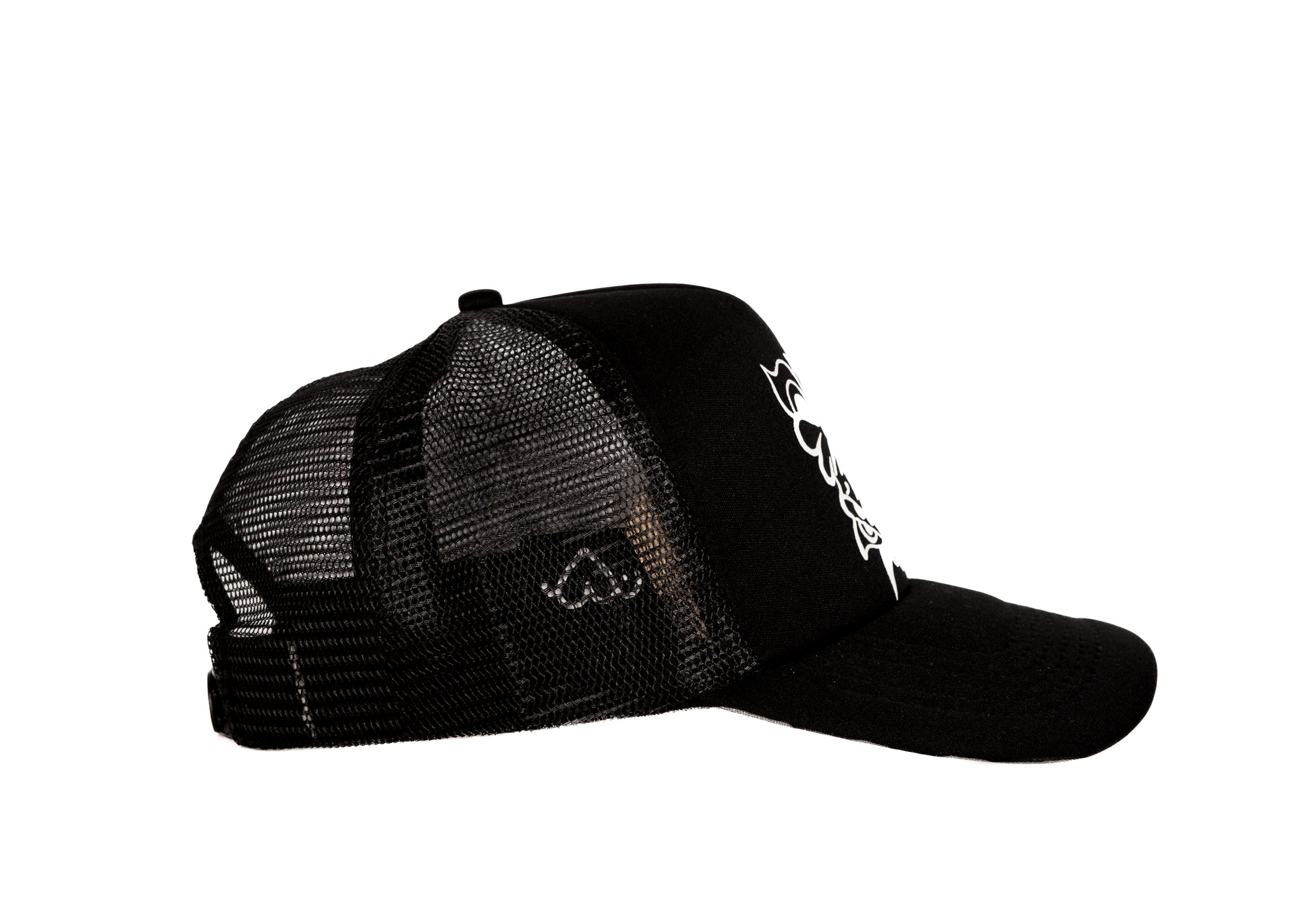 Skullfly emblem 3d puff printed on to black trucker cap with grommet hole and charm, featuring sewn tag inside cap.